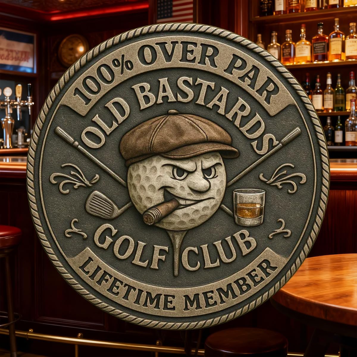 Crafted from zinc alloy with an aged bronze tone, every line exudes old-school character — the grumpy golf-ball face with a cigar, the sharp cross-clubs, even the whiskey in the glass looks like it’s steaming. It’s both a pocket-sized golf novelty and the most spirited piece in your collection.